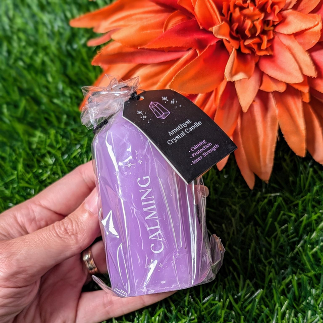 Shaped like a purple crystal tower, this candle offers up to 30 hours of burn time to gradually reveal a rough amethyst crystal hidden at the bottom.