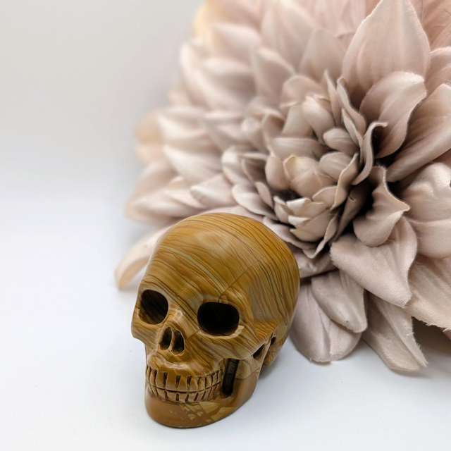 This skull measures approx. 2.5 inches from front to back, and is carved from Picture Jasper.