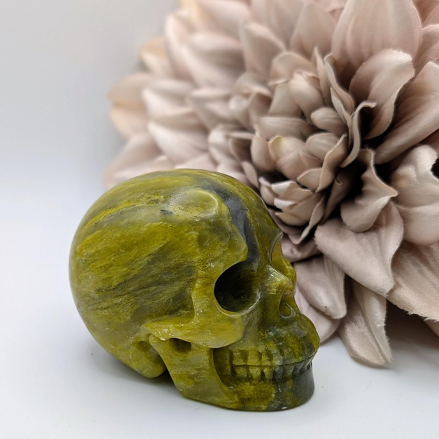 This skull measures approx. 3 inches from front to back, and is carved from Lemon Stone.