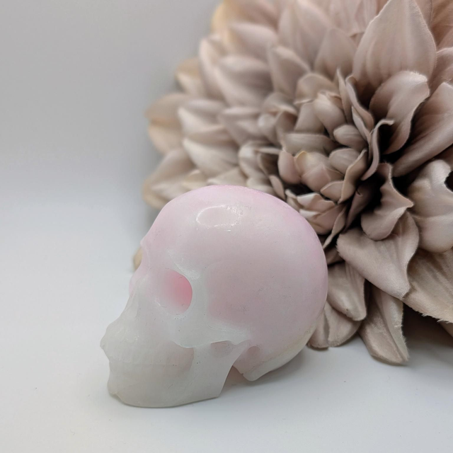 This skull measures approx. 3 inches from front to back, and is carved from Pink Aragonite.