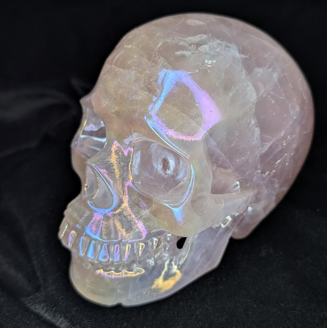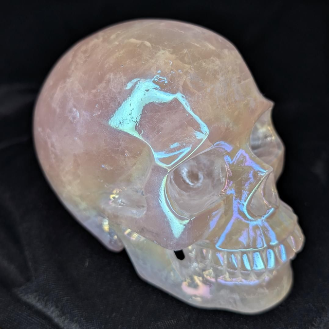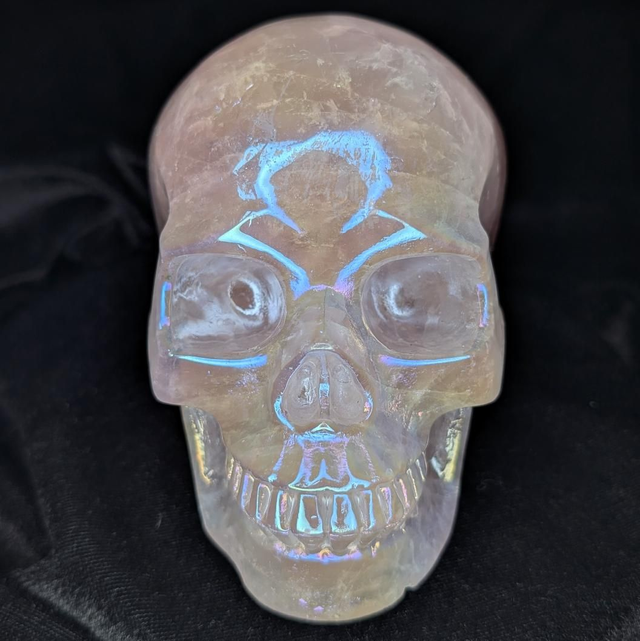 This skull measures approx. 4" from front to back of its base and is carved from aura coated Rose Quartz.