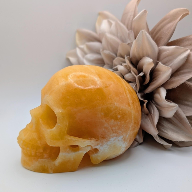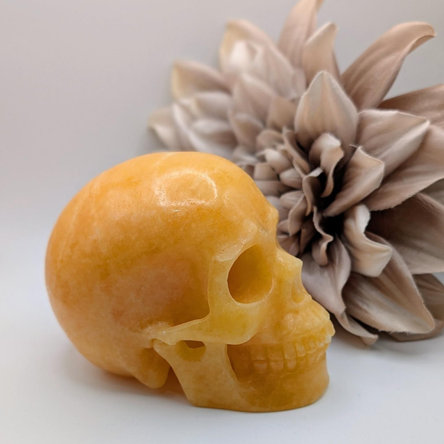 This skull measures approx. 5 inches from front to back, and is carved from Beeswax Jade.