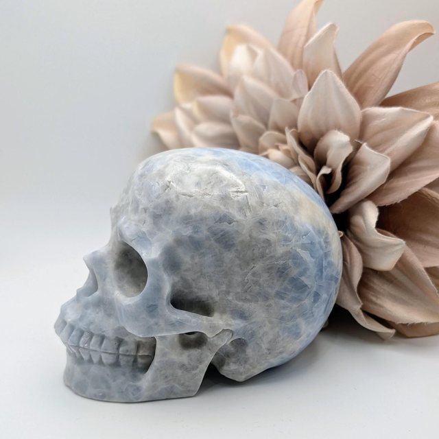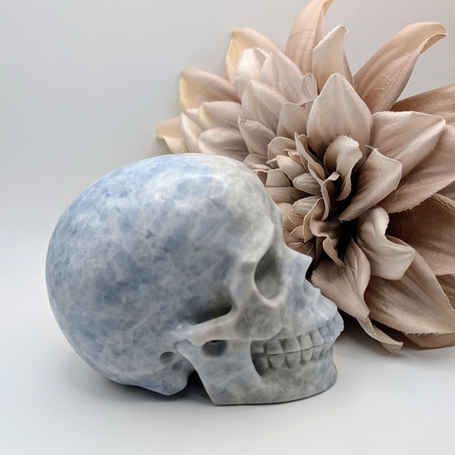 This skull measures approx. 5 inches from front to back, and is carved from Blue Calcite.